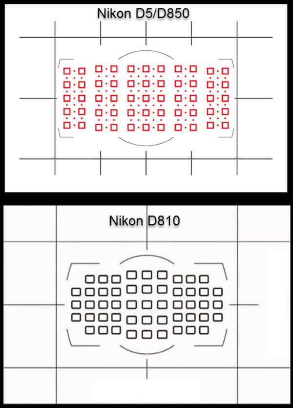 Le nombre de collimateurs AF est plus important sur le D850 puisqu’il reprend le module à 153 collimateurs des Nikon D500 et D5. Mais au-delà du nombre, il faut s’intéresser à la répartition de ces collimateurs.