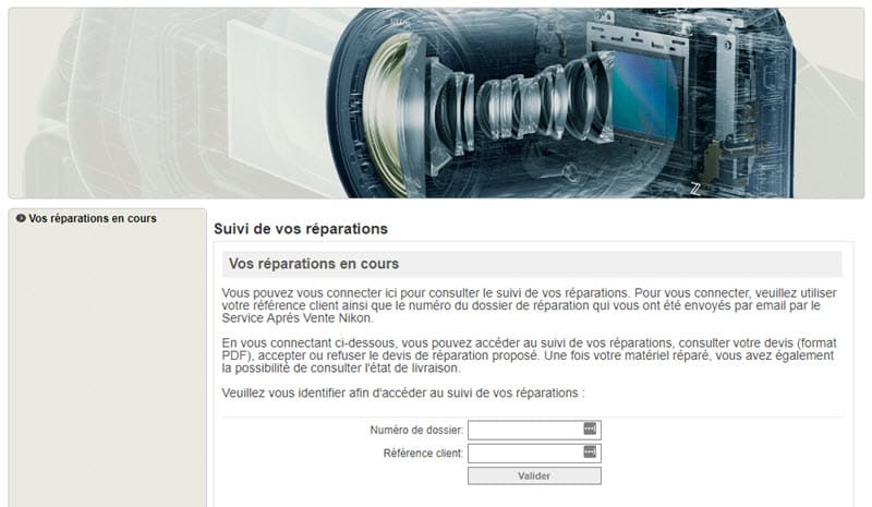 Adresse : https://service.nikonrepair.eu/metrixdirect/LoginFR.htm