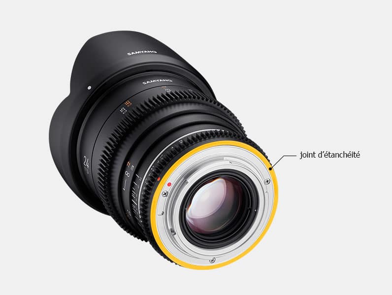 Le Samyang 14mm T/3,1 VDSLR II est équipé d’un joint d’étanchéité côté monture (en jaune sur la photo)
