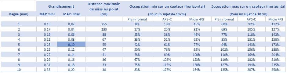 Pour faire une photo macro sans trop perdre de temps, on finit par choisir par réflexe le matériel (focale + bague) adapté à l’image envisagée. L’exercice se révèle plus délicat dès lors que notre pratique est plus occasionnelle. Il se révèle alors pratique d’avoir dans son sac ou sur son smartphone un tableau donnant le grandissement obtenu à la mise au point minimale, en fonction de son équipement.