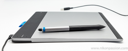 La tablette Wacom Intuos Pen and Touch avec son stylet – l’étiquette bleue sert de support au stylet